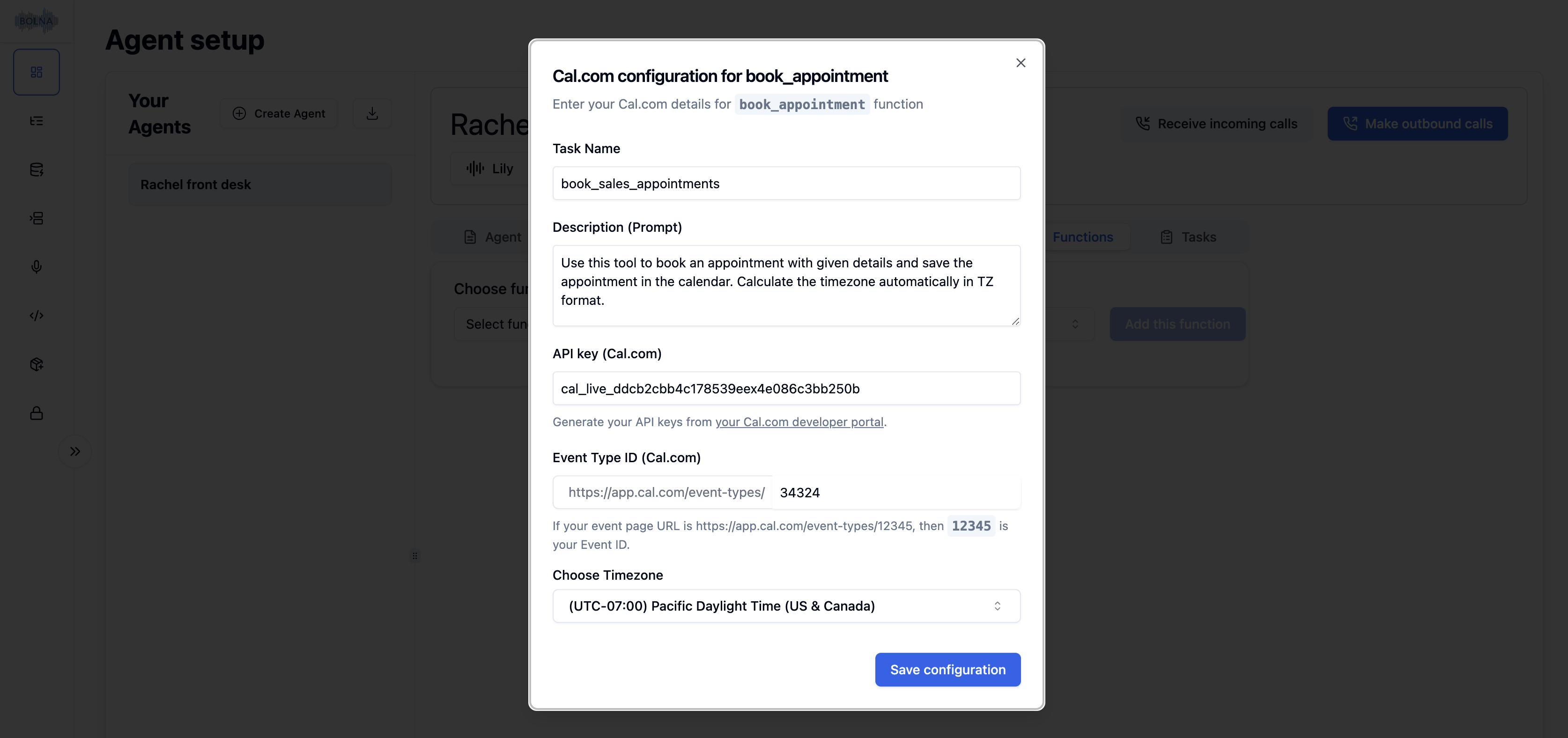 Simply add functions to book calendar appointments(cal.com), transfer calls to human agents in real time, or even create your own function calls